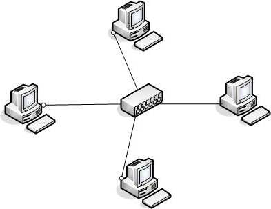 Така приблизна схема інтерфейсу комп’ютерів, об’єднаних в локальну мережу, з хабом. Основний недолік таких мереж – надто багато пересилається інформації. Мережевий концентратор безперервно відправляє пакети даних пристроїв комп’ютерної мережі, причому навіть у тому випадку, якщо адресатом є один конкретний ПК. У той же час комп’ютери отримують блоки інформації, які часто абсолютно їм не потрібні. Технологія насправді виходить дуже витратною. Ось чому зараз мережеві концентратори майже вийшли з ужитку. Натомість були розроблені більш інтелектуальні прилади – мережеві комутатори, які в побуті називають свитчами.