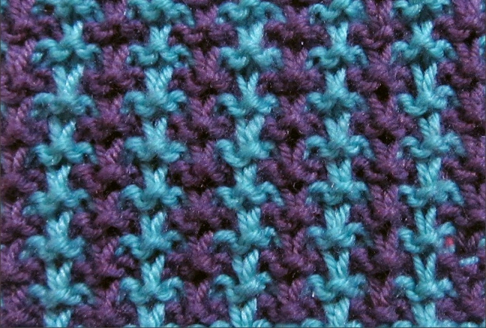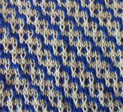 Пропонуємо вашій увазі ще один ледачий жаккард спицями. Майстер-клас з описом в’язання полотна з ниток двох кольорів, фото і схема наводяться нижче. При в’язанні цього візерунка діють всі правила ледачого жаккарда, які ми описували вище. У результаті виходить ефектна в’язка, в якій чергуються діагональні смуги двох кольорів. Такий орнамент підійде для светри, жилета, рукавиць, манжет шкарпеток та інших виробів.