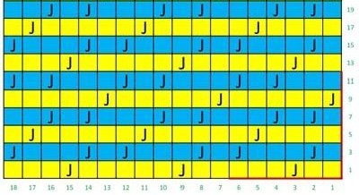 Якщо навіть після наведених описів залишаються питання про те, як пов’язати цей ледачий жаккард, схеми повинні внести остаточну ясність. Нижче нами вказана схема, де клітини двох кольорів позначають ряди в’язання. Порожня клітка означає звичайну лицьову петлю, а клітка зі знаком J говорить про те, що петлю потрібно зняти. Виворітні ряди не позначені на схемі, тому що вони, як ми вже говорили вище, в’яжуться тієї ж ниткою по виворітній стороні, відповідно до узору: зняті петлі знімаються, а решта в’яжуться виворітними.