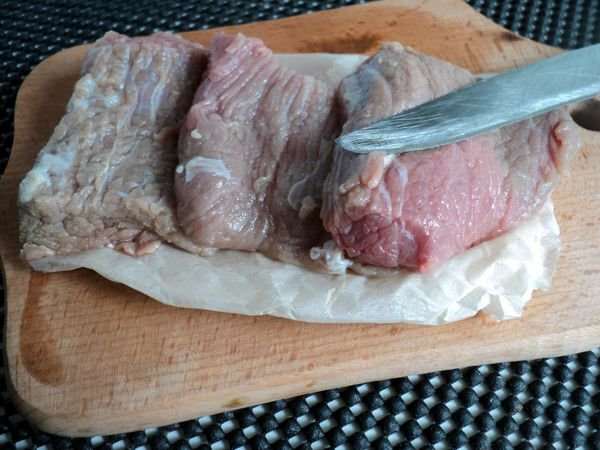М’ясо промийте під прохолодною водою, обсушіть його ретельно паперовою серветкою. Наріжте на невеликі шматочки поперек волокон, це і будуть майбутні стейки.