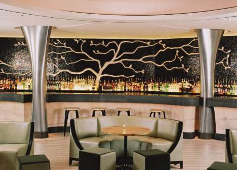Погляд на стелю точно не розчарує. Під ним розташувалися немов застиглі бризки, а парять вони на тлі вкраплень перламутру, зроблених з незвичайною шкіри ската. Всі ці елементи входять в загальний непростий стиль мереж ресторанів, але в цьому інтер’єрі є невеликі зміни, додають закладу свою родзинку. Якщо подивитися у величезне вікно з четвертого поверху, на якому розташований ресторан, можна побачити красиву панораму, яка відображає життя міста. Це також задумана частина інтер’єру, що гармонує зі всім обладнанням ресторану.