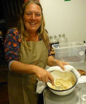 Кухонний стіл злегка притрусим борошном і викладемо на нього готове тісто. Ще кілька разів вымесим його руками, щоб позбутися від вуглекислого газу, що утворився в результаті бродіння дріжджів. Візьмемо качалку і розкотимо тісто в корж товщиною в 1 сантиметр. За допомогою столової ложки викладемо на неї готову начинку.