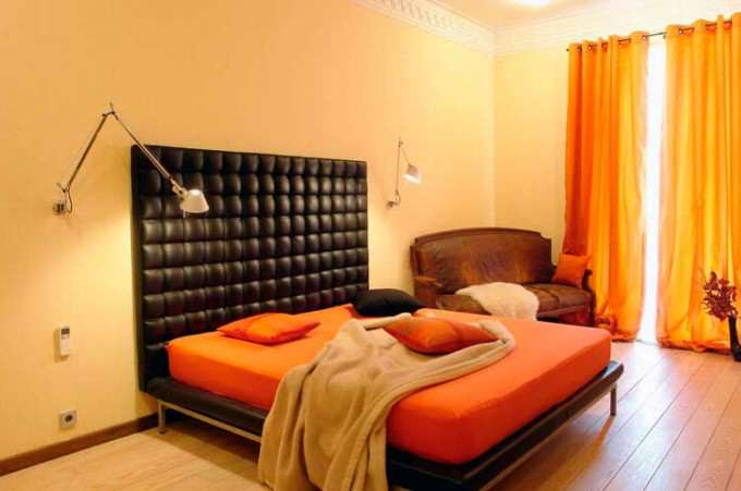 Кімната для чоловіків своїми руками може бути оформлена в чорному стилі з яскраво-помаранчевими елементами, які мають різні виділяються елементи, малюнки, принти.
