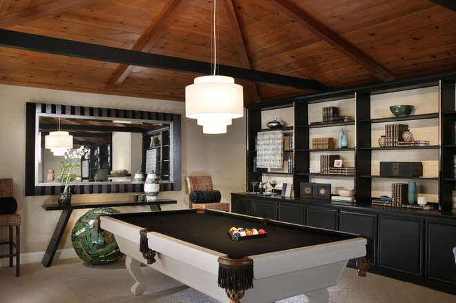 Відмінно буде виглядати в чоловічому дизайні інтер’єру більярдний стіл. У такій кімнаті чоловік зможе проводити час з друзями зі склянкою віскі.