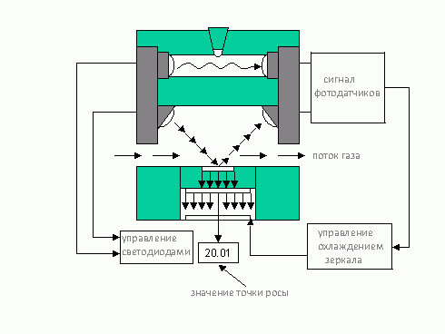 Коли краплі роси формуються на дзеркальній поверхні дзеркала, то відбите світло розсіюється. При цьому, його потік, що потрапляє на фотодетектор, зменшується, що призводить до зміни вихідного сигналу останнього. Це, в свою чергу, контролюється аналоговою або цифровою системою управління термоелектричним кулером, яка підтримує стабільну температуру дзеркала в точці роси. З належним чином розробленою системою дзеркало підтримується при температурі, при якій швидкість конденсації в точності дорівнює швидкості випаровування шару роси. Точний мініатюрний платиновий термометр опору (PRT), вмонтований в дзеркало, вимірює його температуру в цій точці, яка автоматично перераховується в показання вологості.