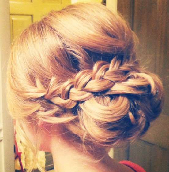 Виявиться стильною і зачіска на випускний, своїми руками зроблена, де присутні елементи плетіння: кіски, колоски, «водоспади» і так далі. Їх особливість полягає в незвичності форми – дівчата не використовують примітивний спосіб плетіння з трьох пасм, а експериментують з різними варіаціями, від 4 до 6 пасм. Великі, об’ємні коси доповнюються начосом або витягуванням волосся для додання більшого обсягу зачісці. В якості аксесуарів для таких укладок використовуються стрічки, які дуже часто вплітаються в самі кіски або колоски.