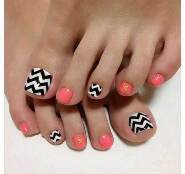Спочатку нігті на великих пальцях покривають білим лаком. Всі інші – кораловим. Або чергуючи за бажанням. Коли лак просохне повністю (можна занурити пальці у ванну з прохолодною водою, щоб прискорити процес), приклеюють зубчасті трафарети на великі нігті. Чорним кольором фарбують вільний простір. Коли лак висохне, трафарети прибирають. Щоб закріпити дизайн, можна покрити нігті прозорим лаком або спеціальним топом.