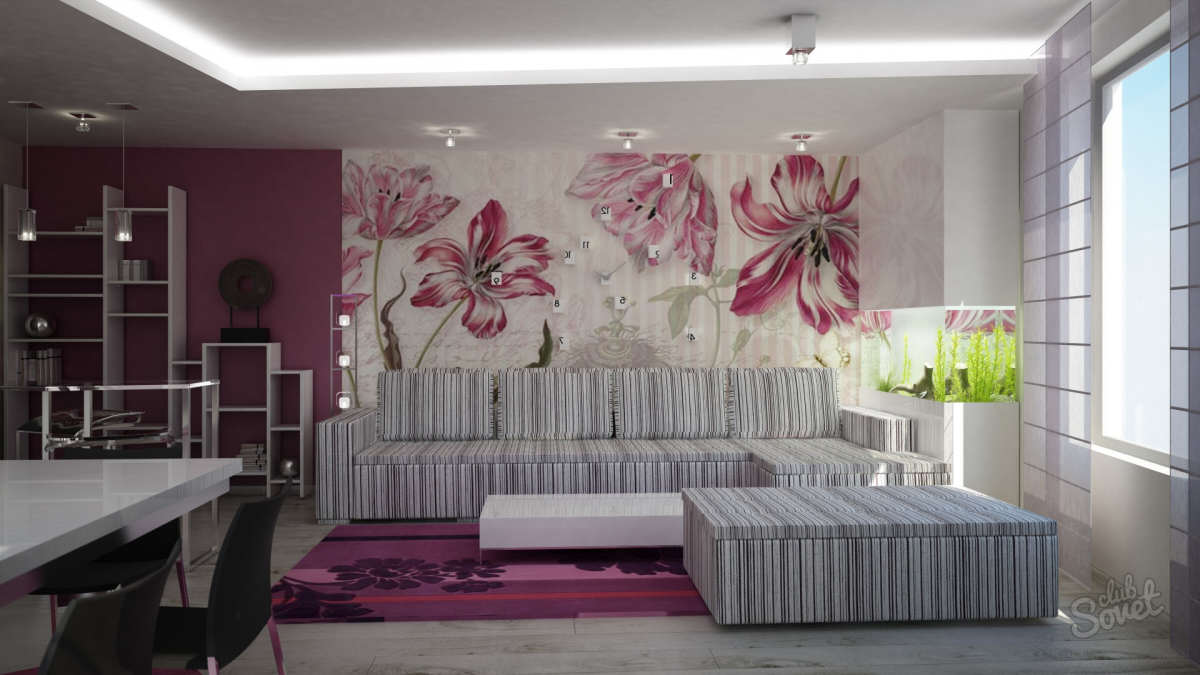 Великі приміщення прикрасять однотонні шпалери з великим малюнком або панно на всю стіну.