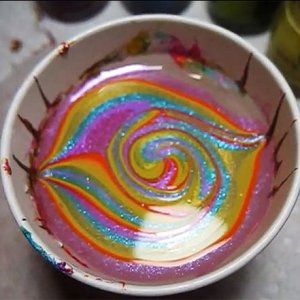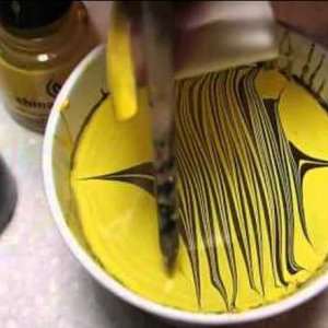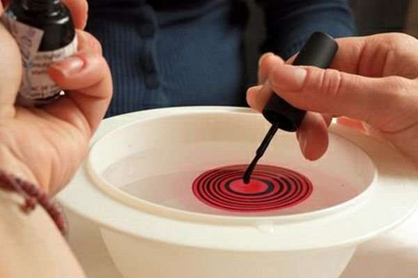 - Коли поверхня води стала являти собою різнокольорові кола, можна робити малюнок. За допомогою зубочистки або тоненькою дерев’яної палички з лакової поверхні проводимо лінії. Вже кілька рухів дадуть незвичайний візерунок. Якщо ж проводити лінії в певному напрямку, можна досягти дивовижних ефектів.
