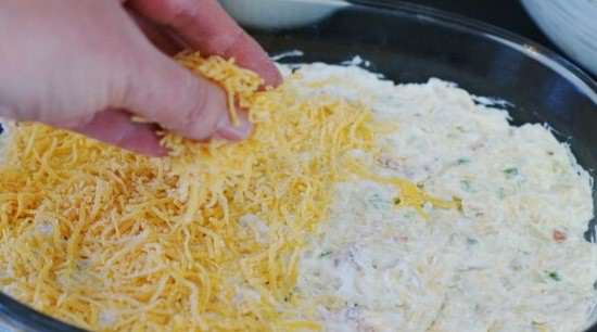 - Віночком збити яйця, додати вершки. Далі покласти крупно тертий сир.