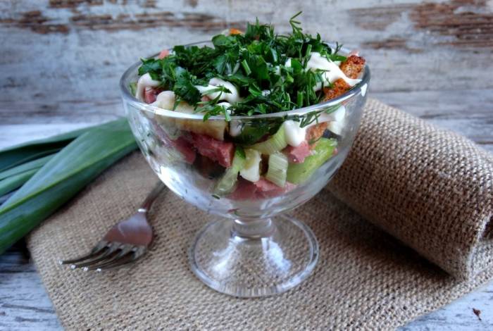 Салат з сухариками і копченою ковбасою