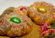 Італійський великодній хліб складається з тіста для бриошей зі смаком анісу, скрученого у формі вінка, прикрашеного фарбованими яйцями та посипанням, і випікається до золотаво-коричневого...